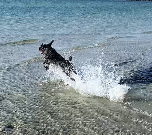 Jeg svømmetræner også mine schweisshunde ved stranden. Her kaster jeg bolde eller pinde, jeg finder på stranden, langt ud i vandet, som hundene elsker at svømme ud og hente.